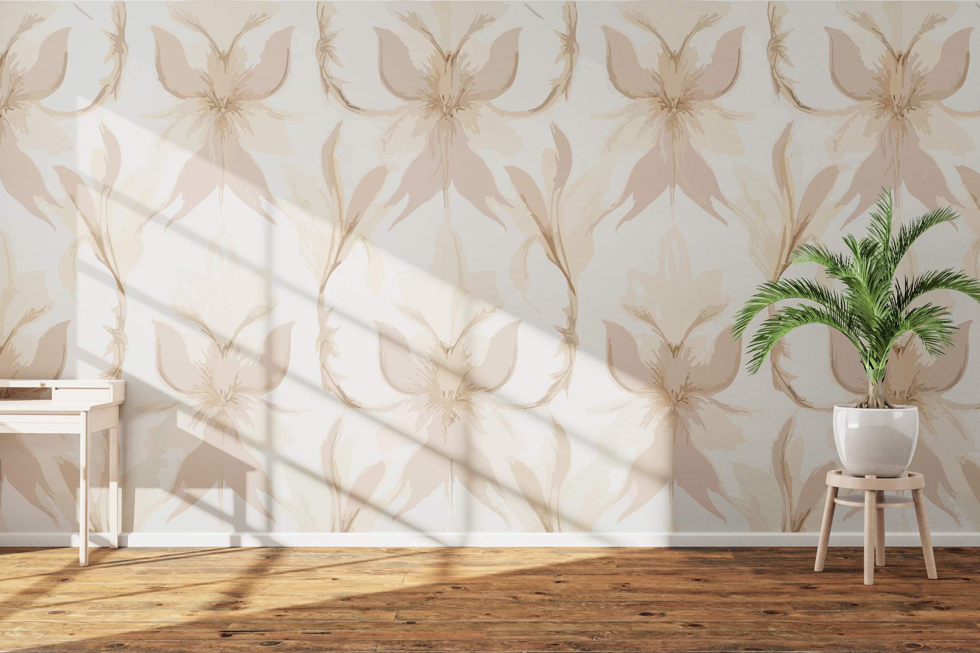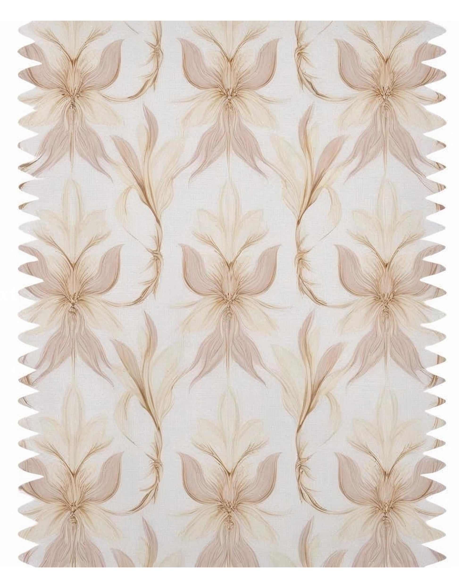 Decorative fabric featuring a soft beige background with delicate, flowing floral patterns in muted gold and blush tones. The fabric’s refined design and subtle color palette make it ideal for home décor, upholstery, or custom textile projects.