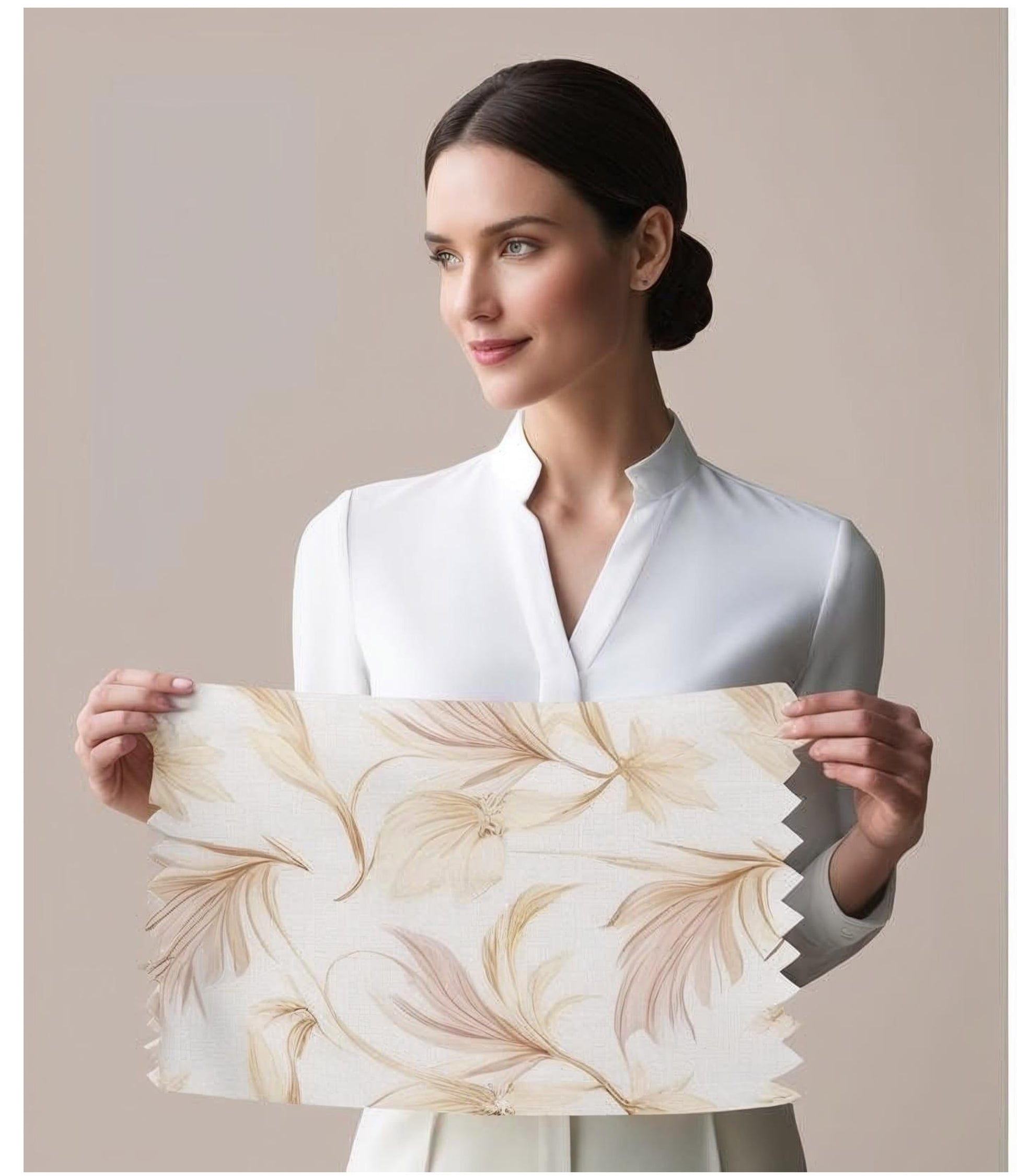 قماش زخرفي بخلفية بيج ناعمة مع نقوش زهرية رقيقة متدفقة بدرجات اللون الذهبي والوردي الهادئة. تصميمه الأنيق ولوحة ألوانه الناعمة تجعله مثاليًا للديكور المنزلي، أو التنجيد، أو مشاريع المنسوجات المخصصة.