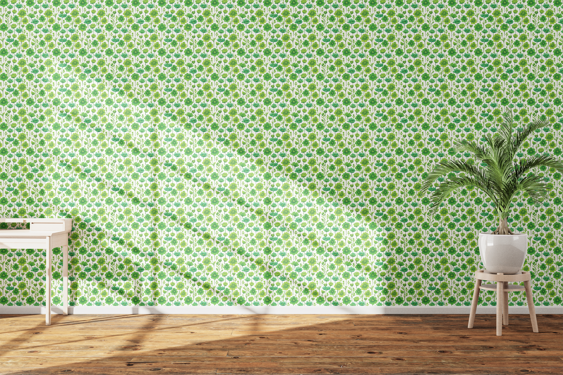A seamless botanical pattern featuring a variety of green flowers and foliage on a white background. The design showcases different shades of green, creating a fresh and vibrant look ideal for textiles, wallpapers, and decorative projects. The hand-painted style adds a natural and artistic touch to the overall composition.