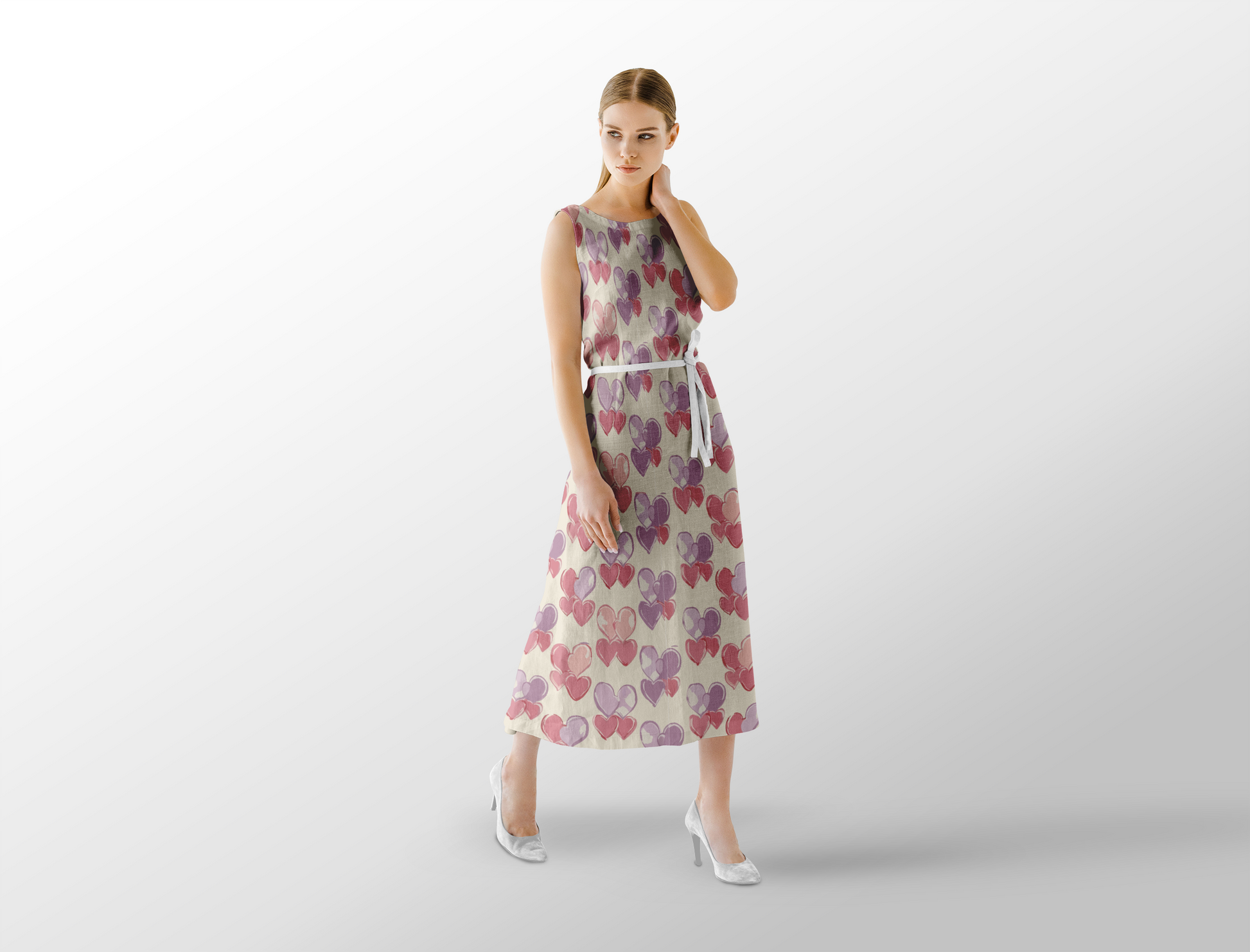 A playful repeating pattern featuring clusters of hand-drawn hearts in soft shades of pink, lavender, and mauve on a light cream background. The overlapping hearts create a whimsical and romantic design, perfect for use in children’s rooms, nurseries, or as a cheerful accent in stationery and gift wrap.