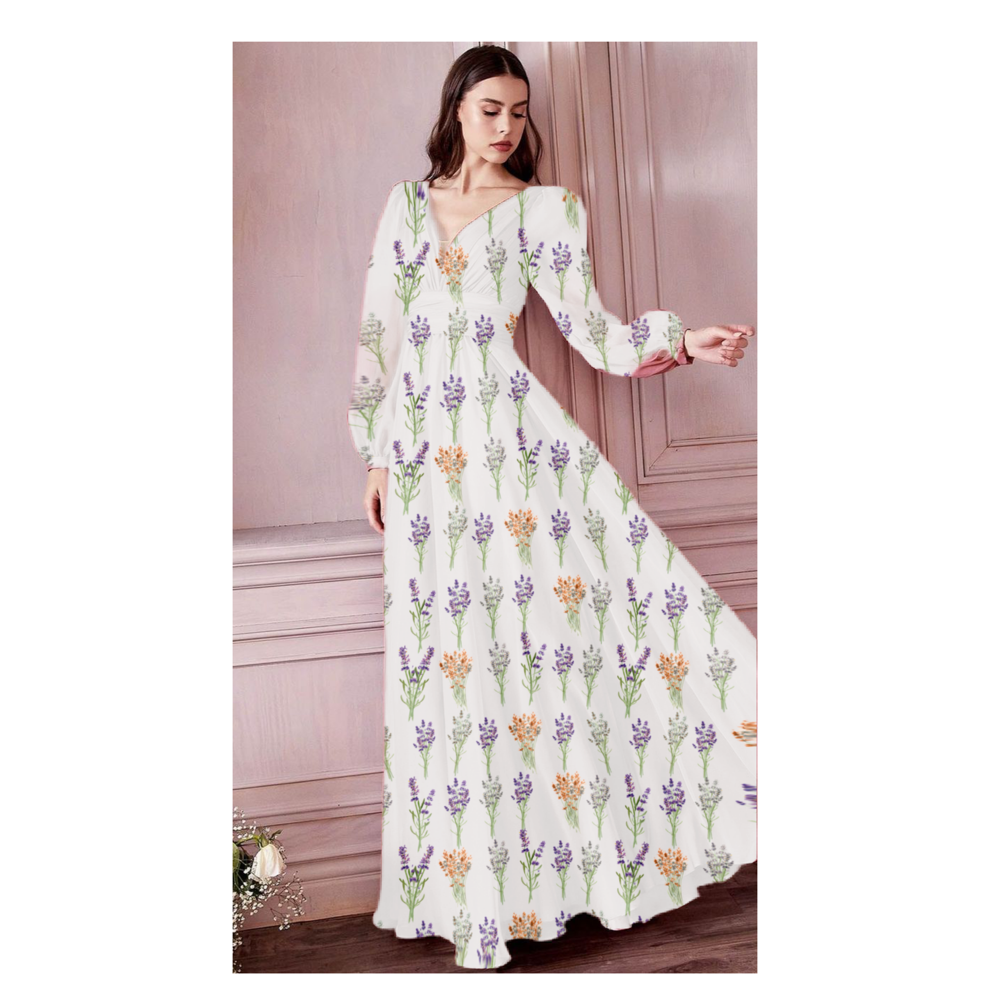 يتميز هذا النمط الجذاب بباقات مرسومة يدويًا من زهور الخزامى والزهور البرية بألوان ناعمة من البنفسجي والأبيض والبرتقالي. كل باقة رقيقة مزينة بتفاصيل دقيقة، تجسد جمال وأناقة الزهور البرية. مثالي للمطبوعات القماشية، والقرطاسية، وورق الجدران، والخلفيات الرقمية، ويضفي لمسة نباتية منعشة على أي مشروع.