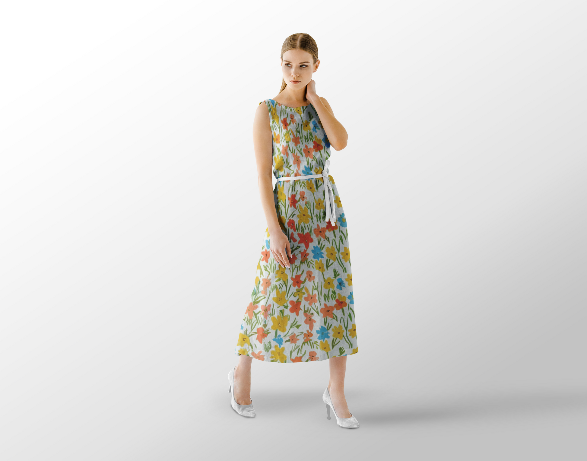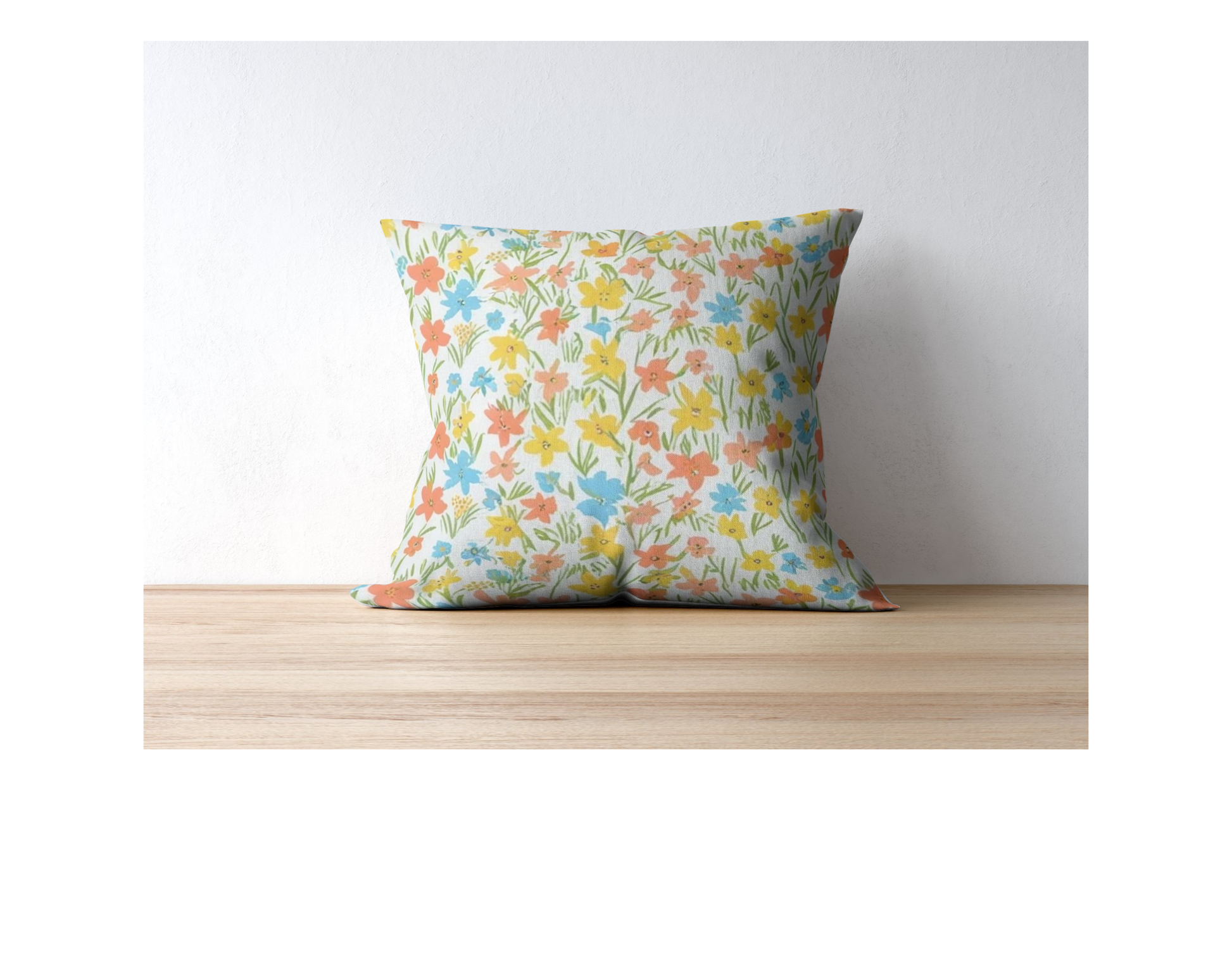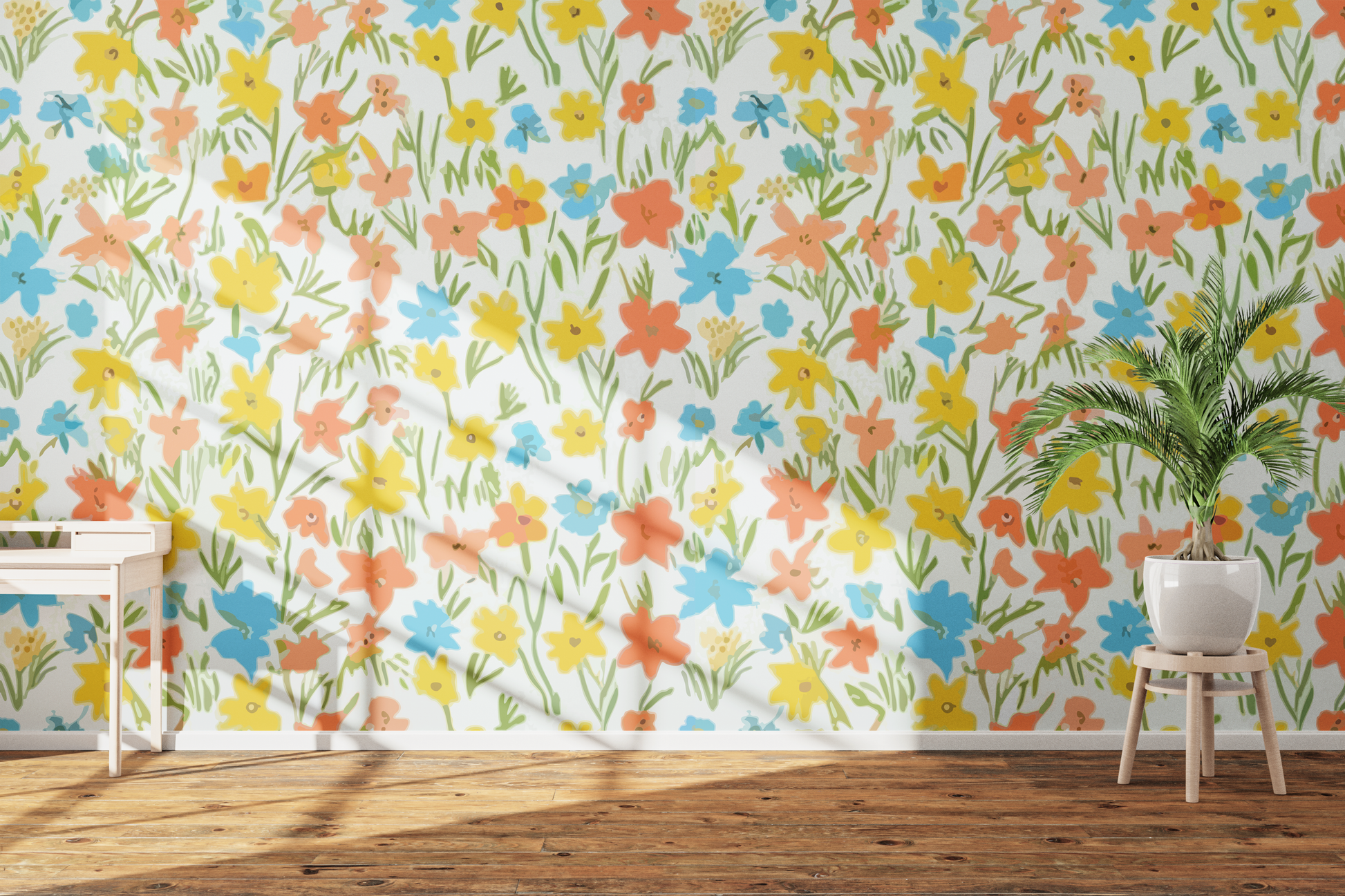 A lively floral design featuring a mix of red, yellow, blue, and peach blossoms scattered across a white background. The colorful arrangement of wildflowers and greenery creates a cheerful, fresh, and playful look, perfect for textiles, wallpapers, gift wrap, and creative digital projects.