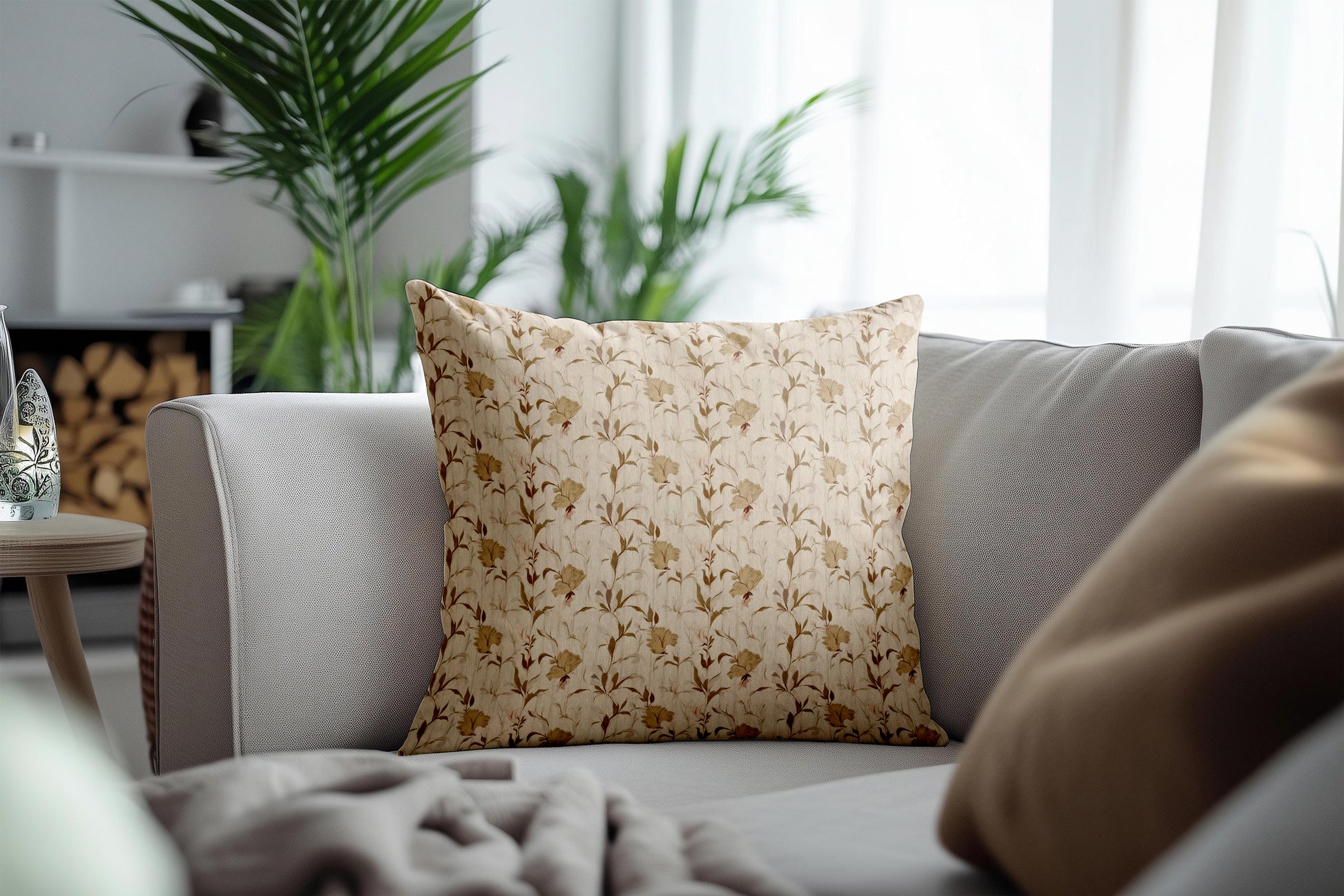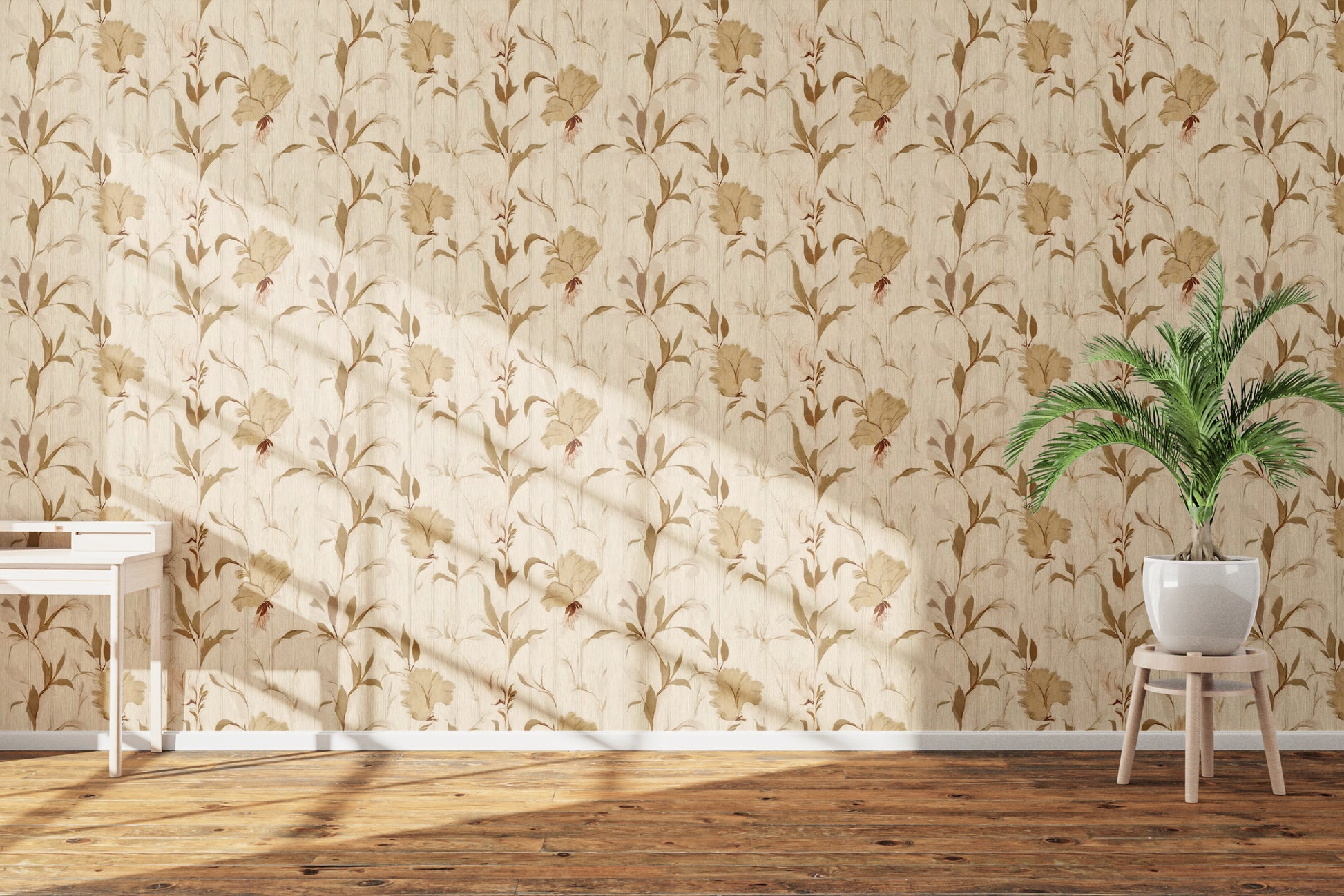 This elegant wallpaper pattern features a vintage botanical design with delicate floral motifs in soft, earthy tones. The subtle beige background is adorned with graceful leaves and blossoms, creating a warm and inviting atmosphere. Perfect adding a touch of timeless charm to any room, this pattern blends classic style natural beauty, making it ideal for living rooms, bedrooms, or cozy reading nooks.