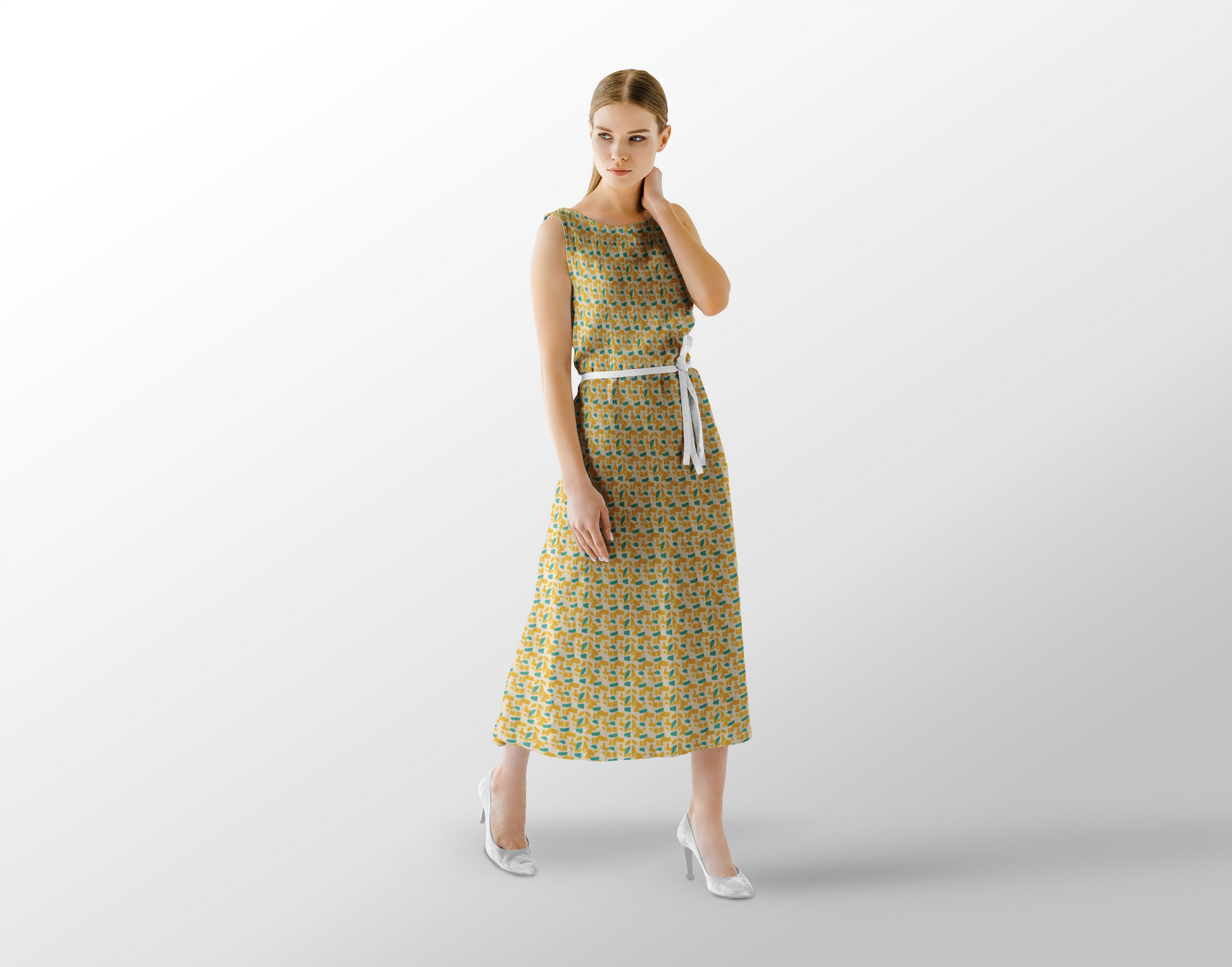 A seamless pattern featuring interlocking geometric shapes in warm yellow and cool teal tones. The repetitive design creates a sense of rhythm and balance, making it ideal for textiles, wallpapers, or digital backgrounds. Its playful yet structured aesthetic adds a lively and modern touch to any creative project.